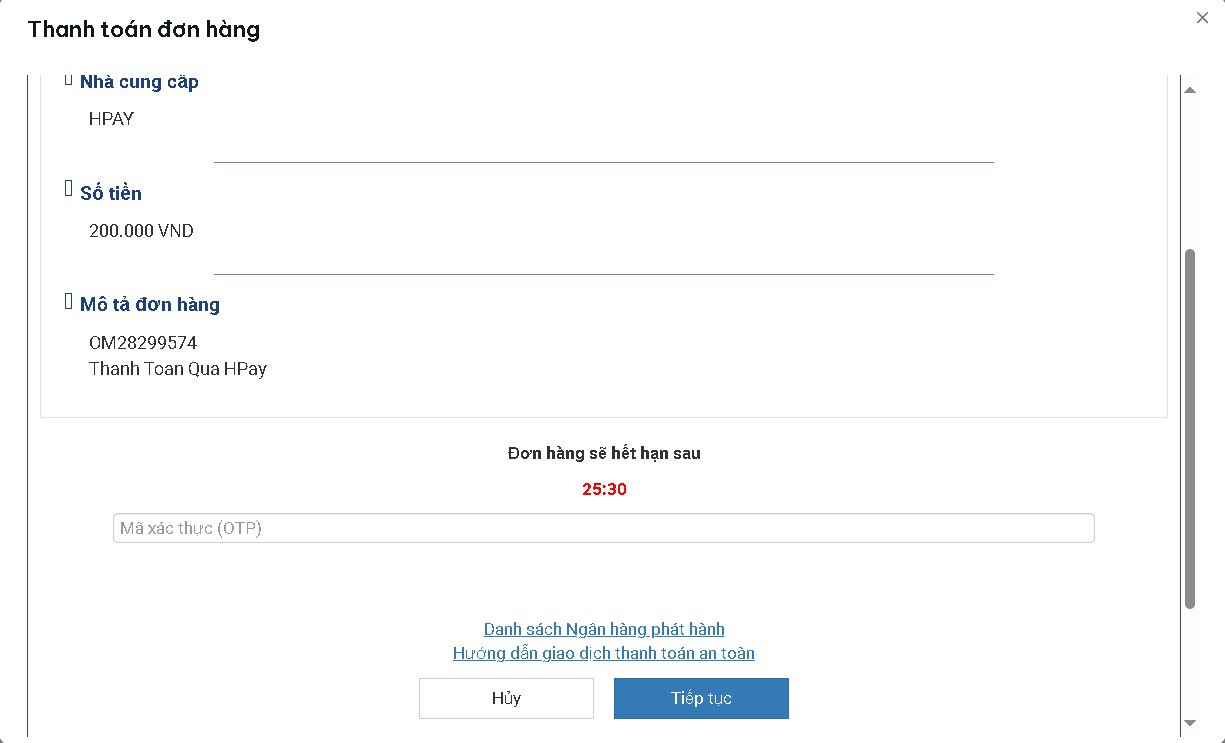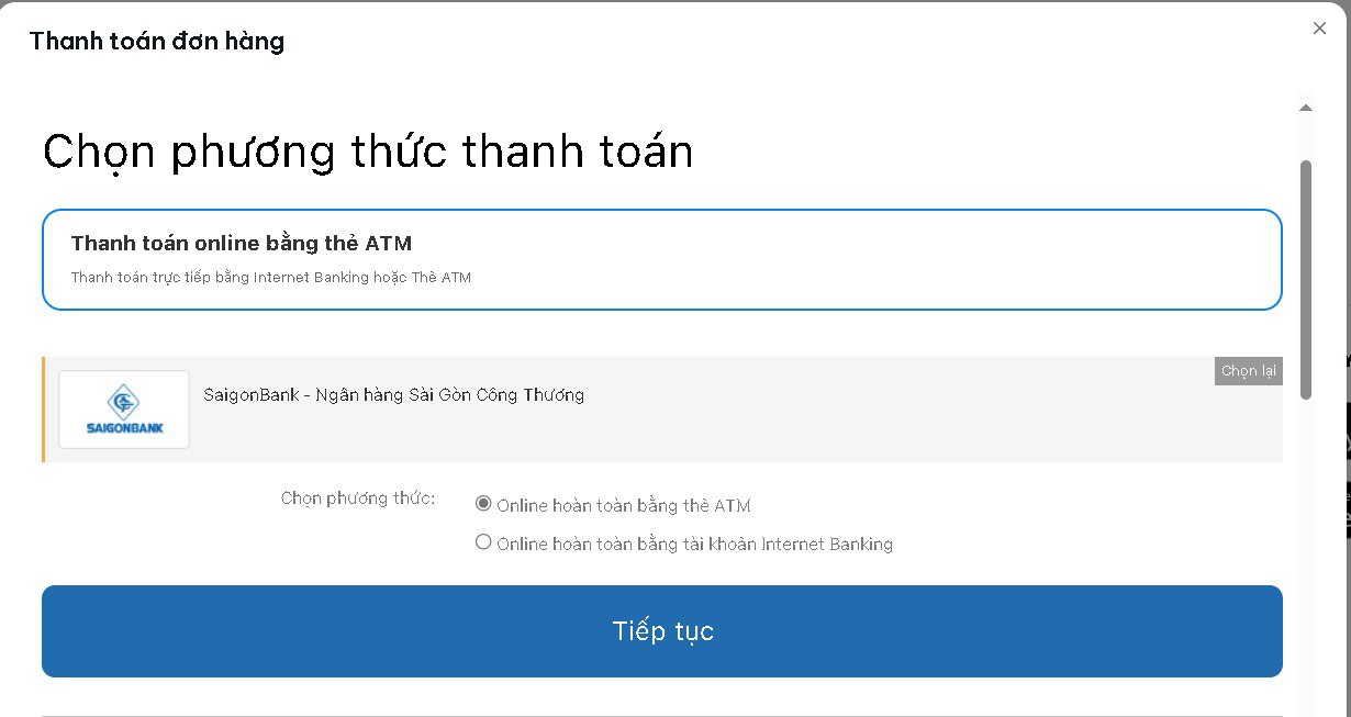 Bước 4 : Sau khi chọn ngân hàng muốn thanh toán và bấm tiếp tục”